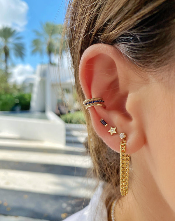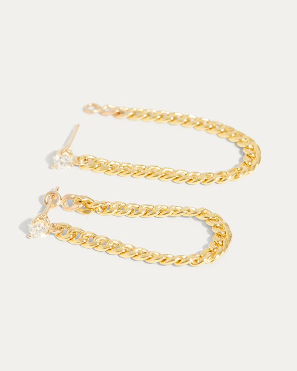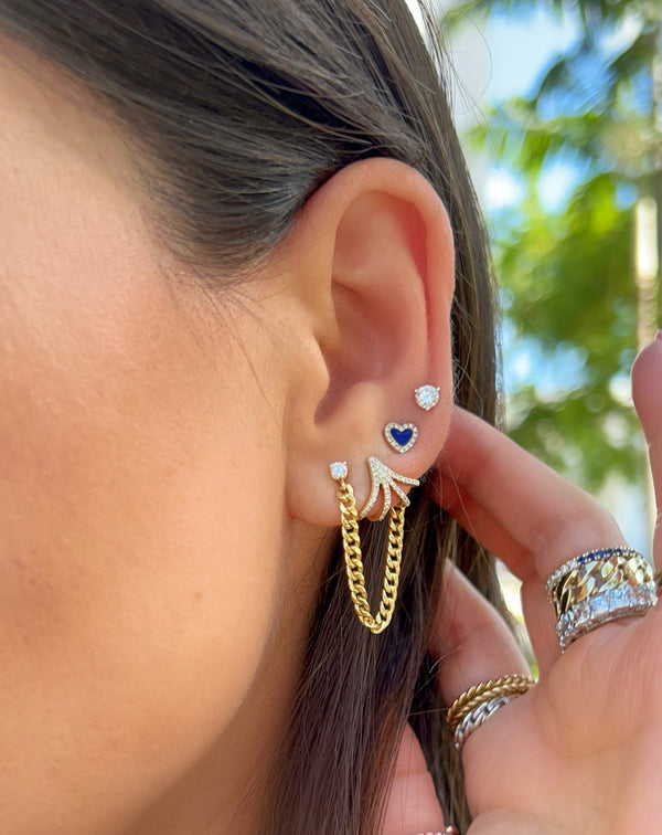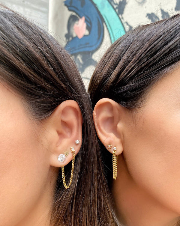 Our 3 Prong Diamond Chain Earring is a 3 in one earring. The 3 prong martini style setting allows the earring to sit very flat and close to your ear lobe. The curb link chain is set with a jump ring at the end, allowing it to be moved from one ear piercing to another. The most perfect chain earring you will own and love to style. Make it your own style, put a twist to your everyday earring stack.