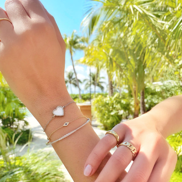 Our Double Sided Enamel Heart Bracelet Is a beautiful creative piece we designed to make your bracelet stack stand out. Choose your color enamel and color gold. The bracelet is adjustable.