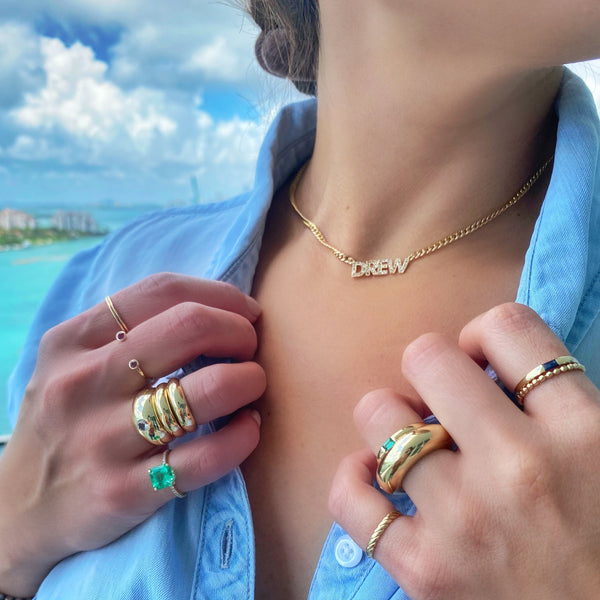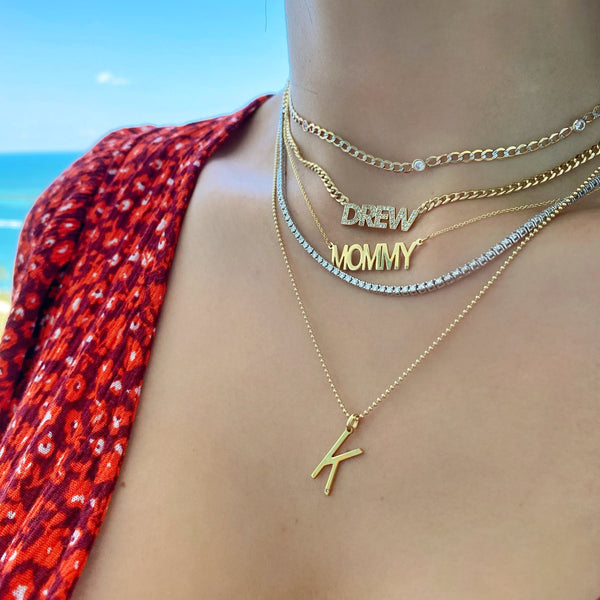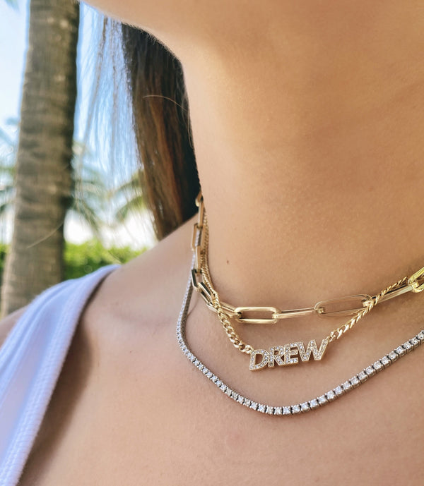Our pave diamond block letter name necklace on a cuban link chain is very classic, trendy and bold at the same time. Everyone will notice and love your beautiful custom piece. Made to be worn on the shorter side of 15 or 16 inches. Can be made longer if needed.