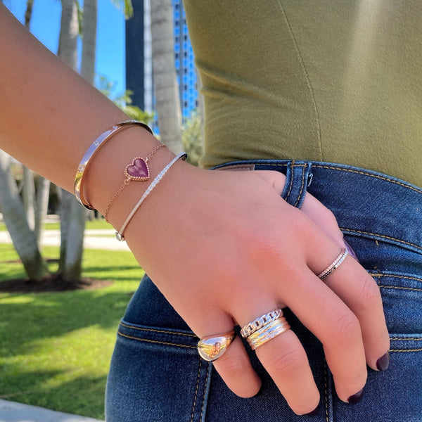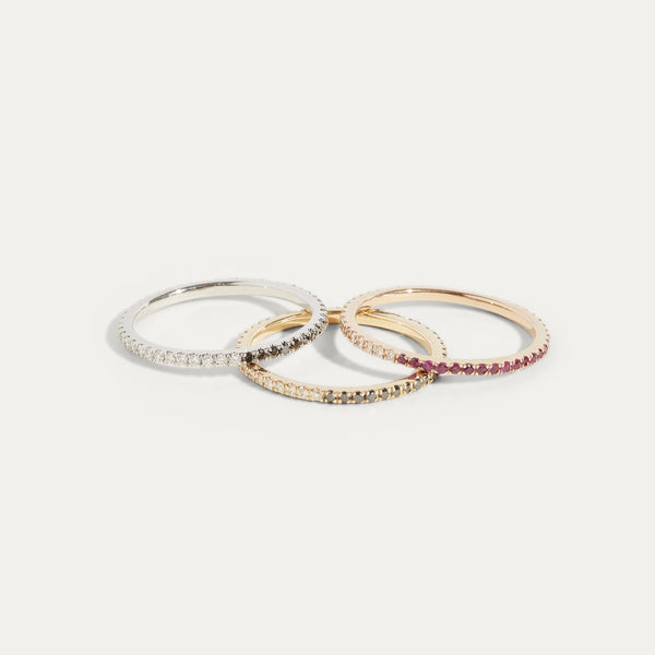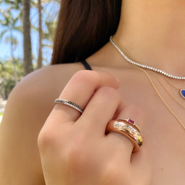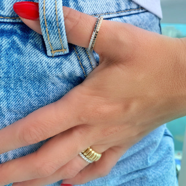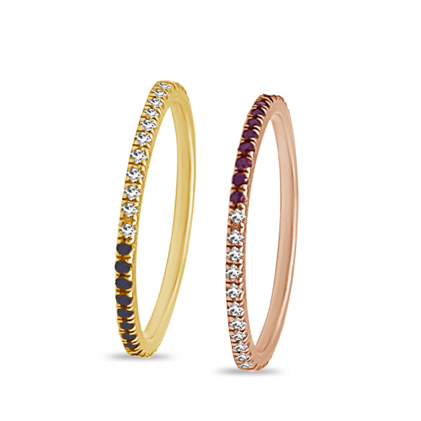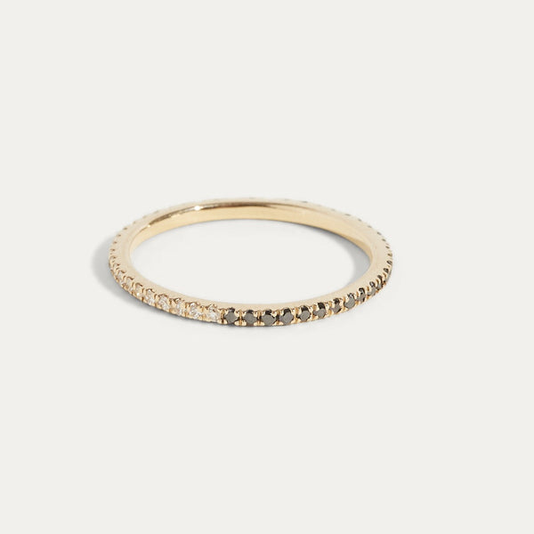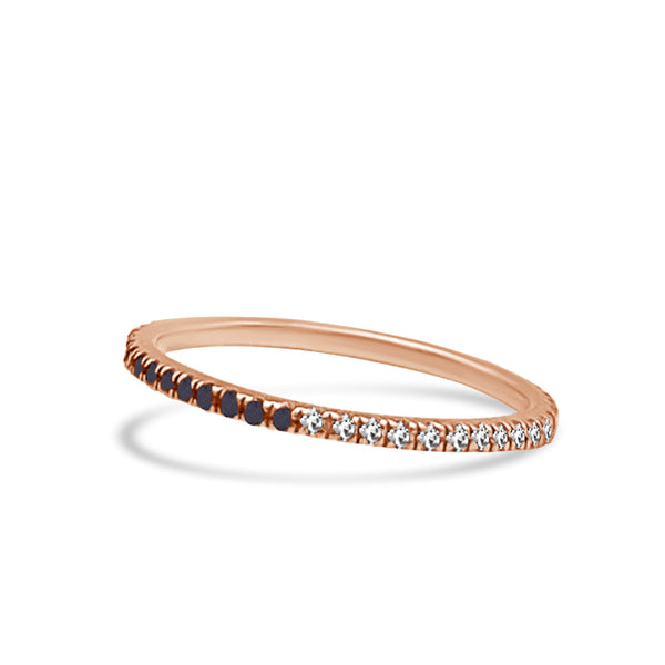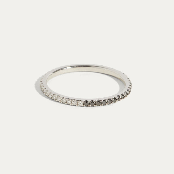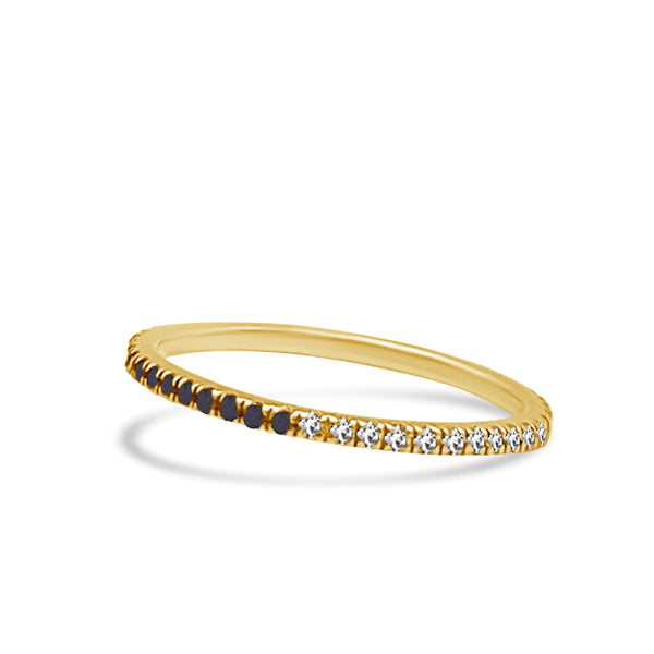 Our half & half diamond- black diamond eternity band is thin, dainty and the perfect piece. You have the option to wear it on the white diamond side or the black diamond side for the edgy look. Or of course the half & half look giving it that unique look. Perfect for stacking or to wear alone.