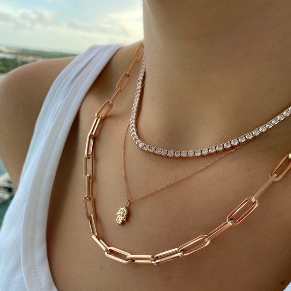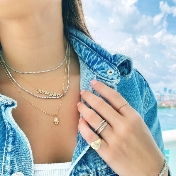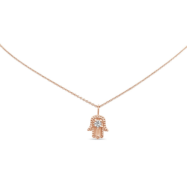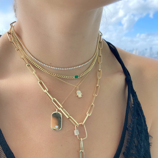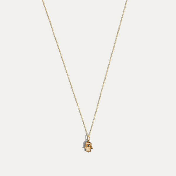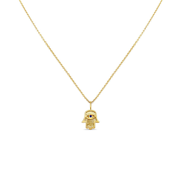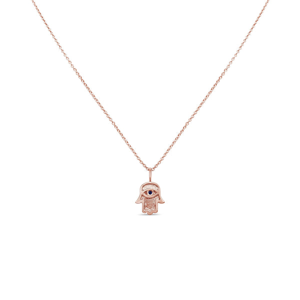 Our KC big diamond hamsa hand is the perfect twist between dainty and classic. It has a bigger diamond center giving that extra sparkle from a even a distance. Everyone will notice your beautiful hamsa hand!! Layer it or wear it alone. We have a surprise design on the back. There is small evil eye with a blue sapphire stone, just incase your necklace every turn the other direction. Its perfect!