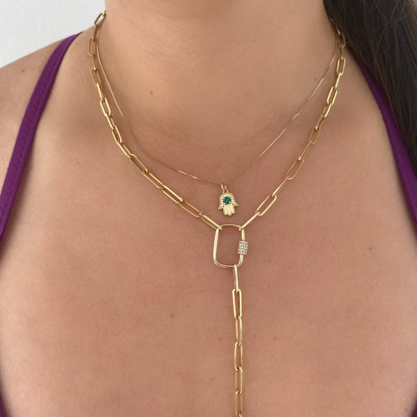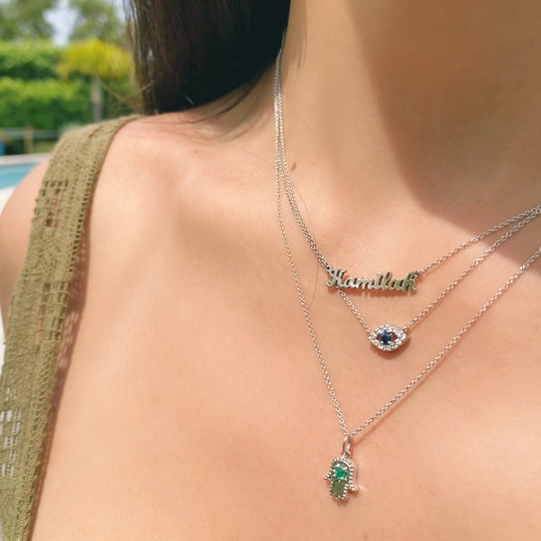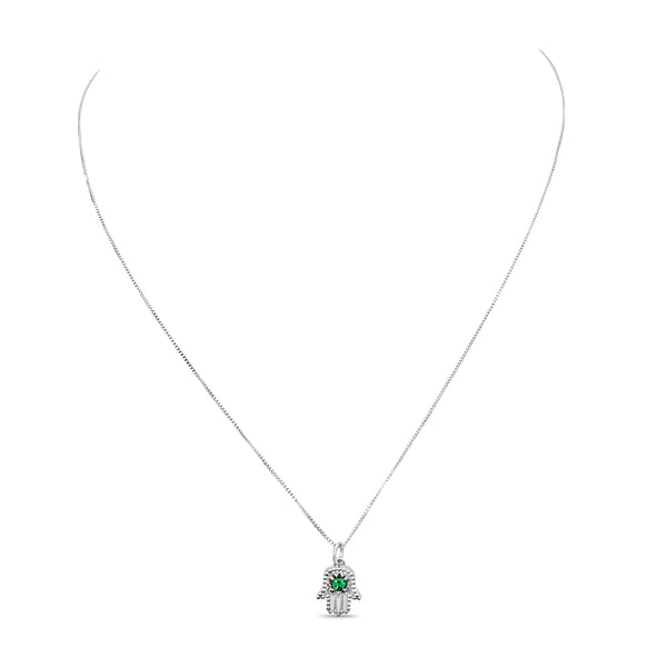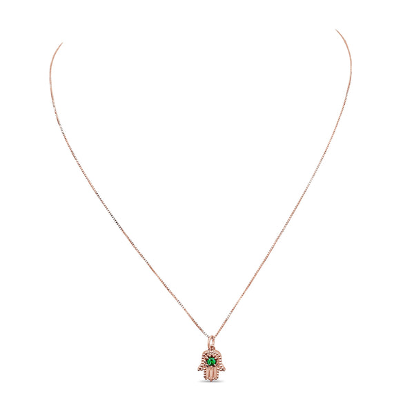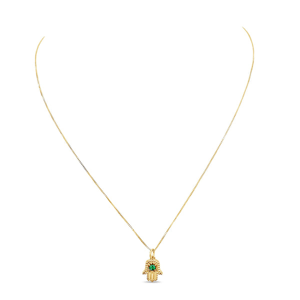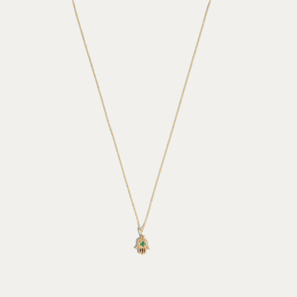 Our KC emerald hamsa hand is a beautiful piece and a show stopper. The detail on this piece is one of a kind. It looks great worn alone or layered with your favorite necklaces.