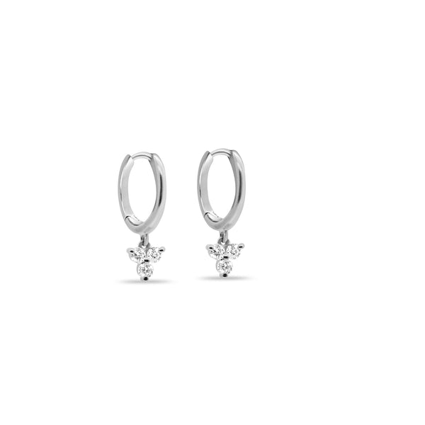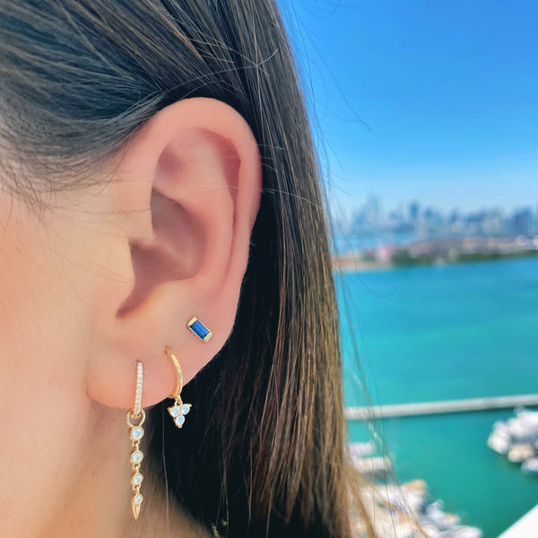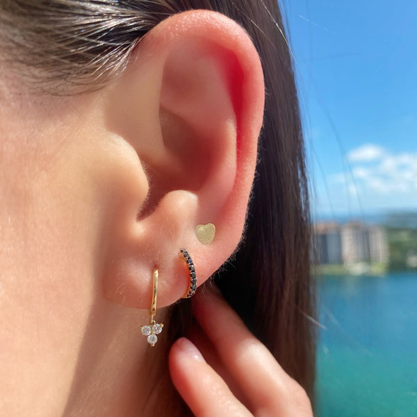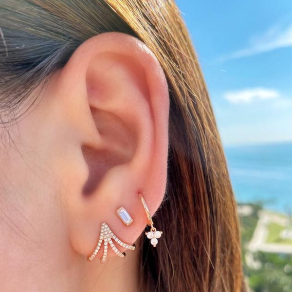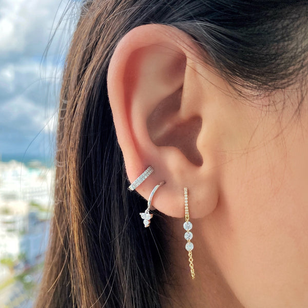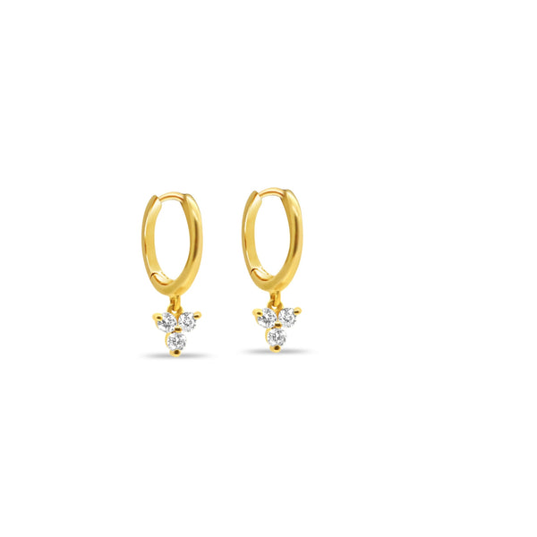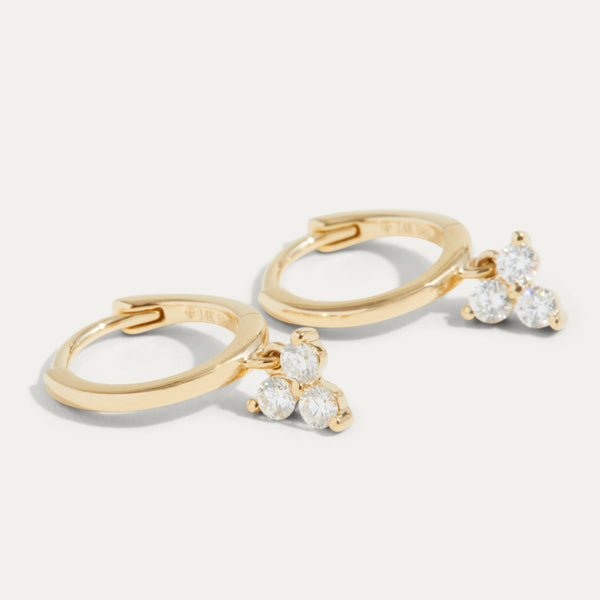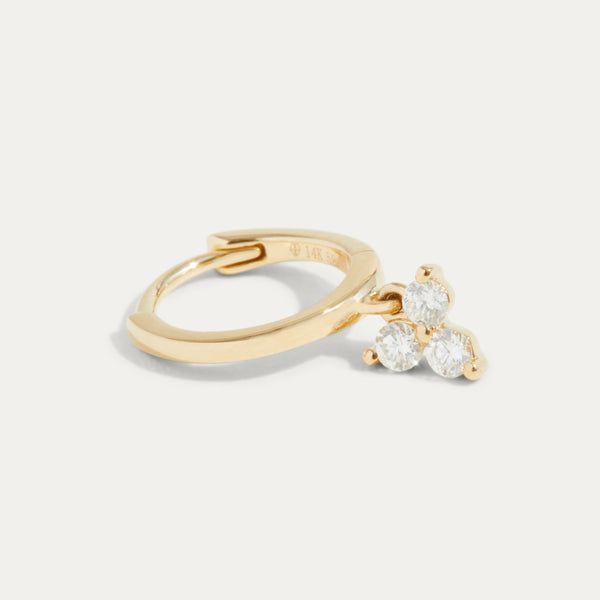 Our hanging diamond trio huggie is the perfect combination of solid gold and a diamond sparkle with its three fixed diamond charm. We sell them as individuals because the trend is to make both your ear look completely different when stacking. But also are very beautiful as a pair as well.